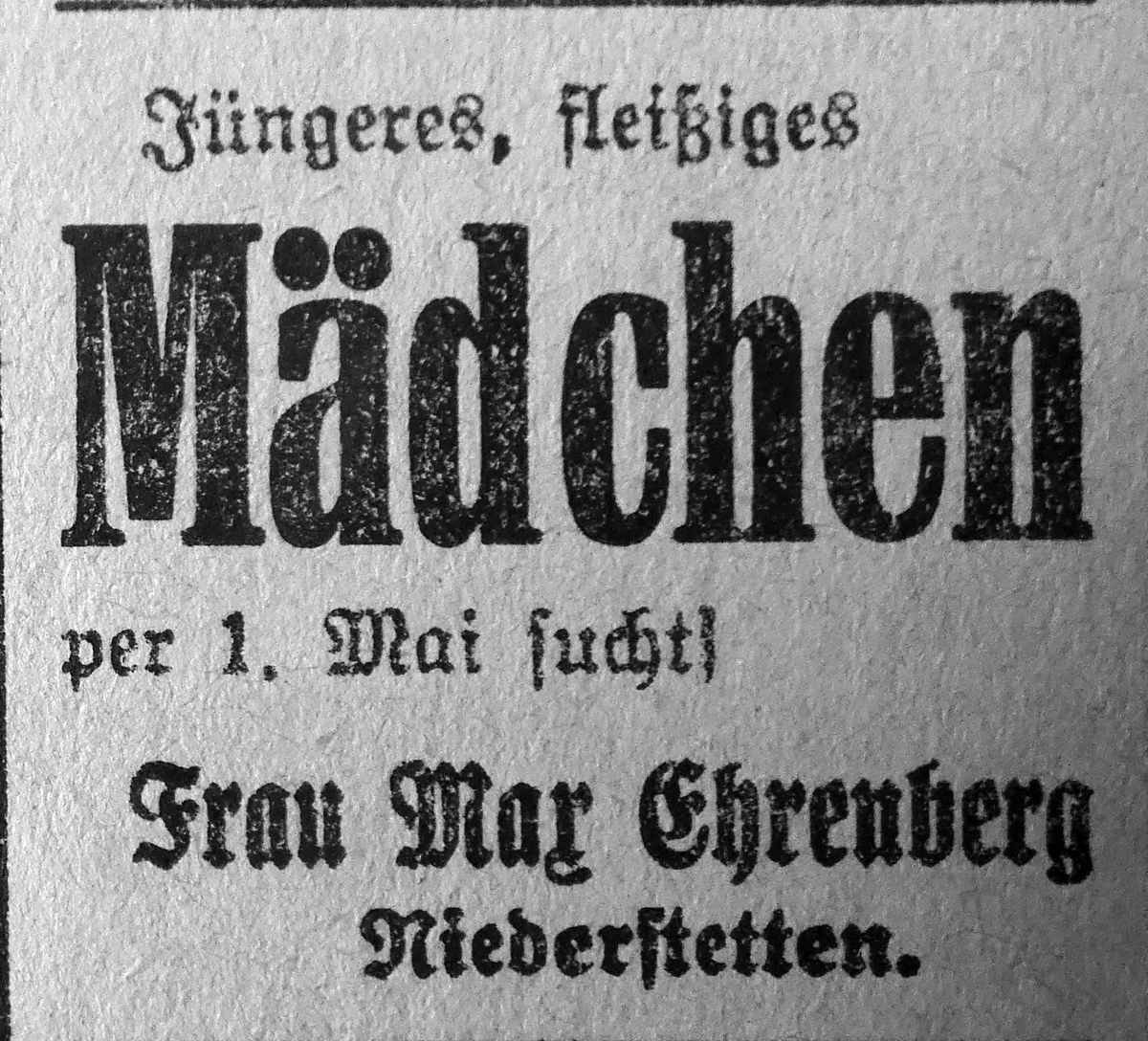 14. April 1928. Frau Max Ehrenberg sucht "Mädchen"