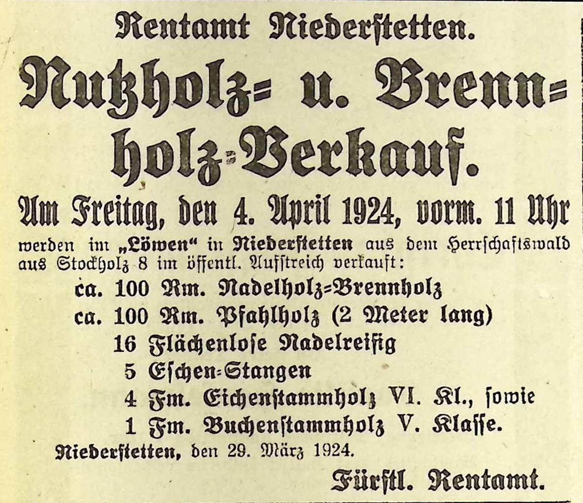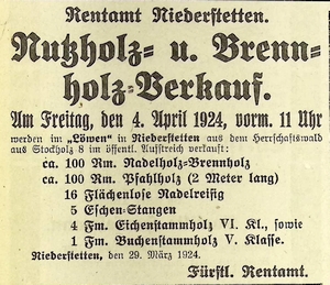 1. April 1924. Anzeige Nutzholz- und Brennholz-Verkauf
