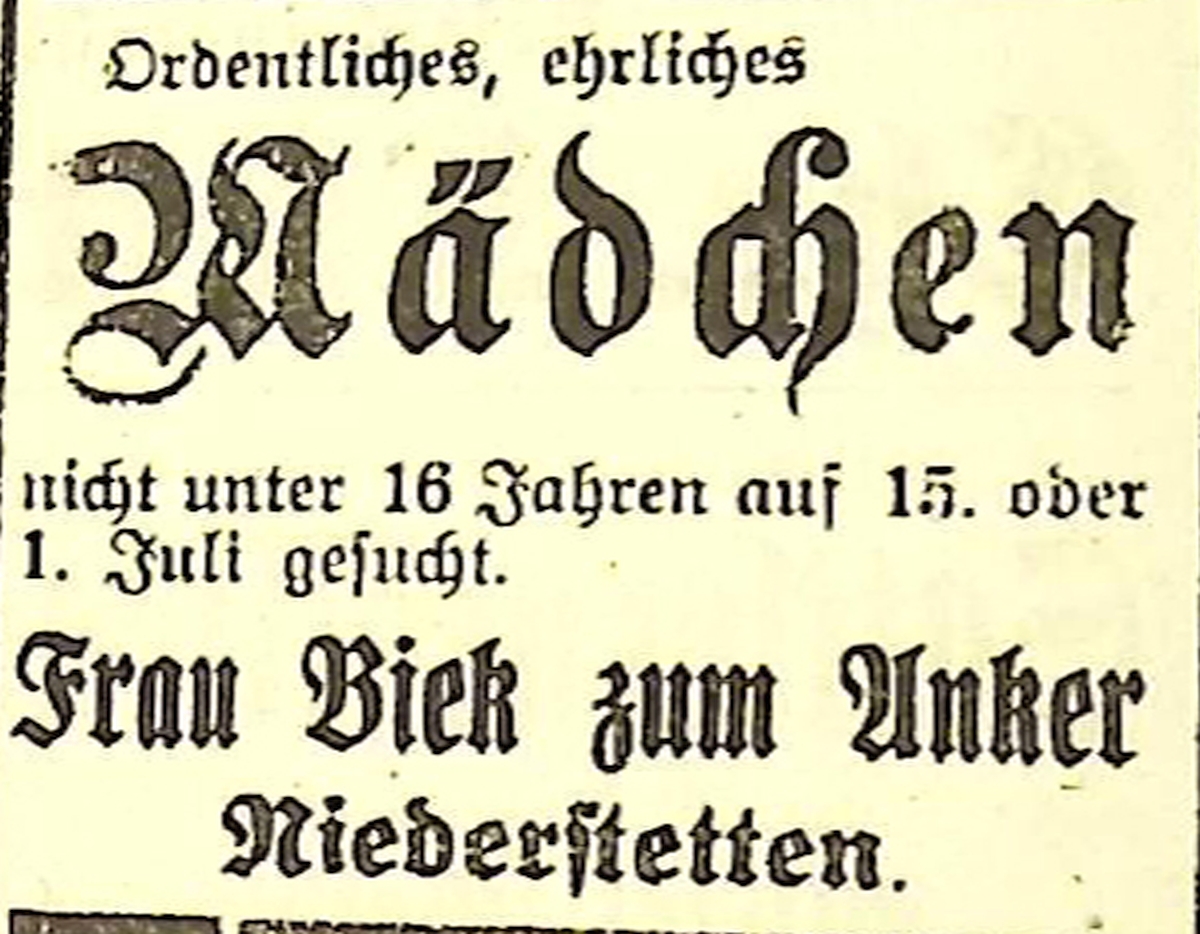 1. Juni 1924. Anzeige Frau Biek zum Anker sucht "Mädchen"