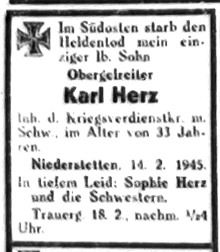 15. Februar 1945. Todesanzeige Karl Herz