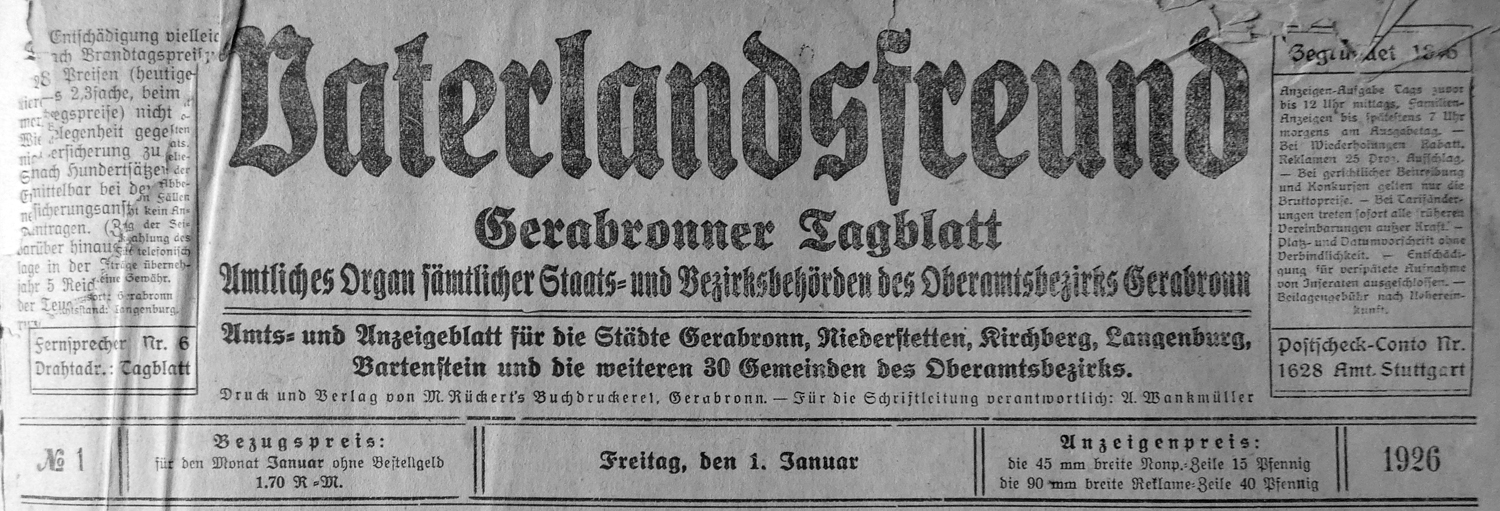 Nachfolgend die Artikel der in Gerabronn erschienenen Oberamtszeitung "Vaterlandsfreund". Der Jahrgang 1926 enthält darüber hinaus noch eine beträchtliche Anzahl teils gewerblicher, teils privater Anzeigen, die Niederstetten betreffen und die hier nicht eingearbeitet sind. Zur Auswertung wurde der Zeitungsband freundlicherweise von Herrn Rolf Wankmüller, Gerabronn zur Verfügung gestellt.