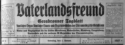 Nachfolgend die Artikel der in Gerabronn erschienenen Oberamtszeitung "Vaterlandsfreund". Der Jahrgang 1927 enthält incl. Wiederholungen geschätzt ca. 140 teils gewerbliche, teils private Anzeigen, die Niederstetten betreffen und die hier nicht eingearbeitet sind. Zur Auswertung wurde der Zeitungsband freundlicherweise von Herrn Rolf Wankmüller, Gerabronn zur Verfügung gestellt.